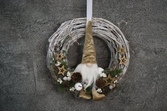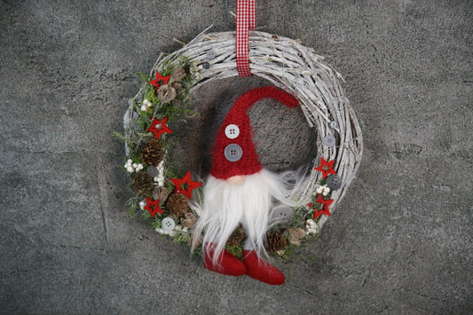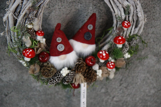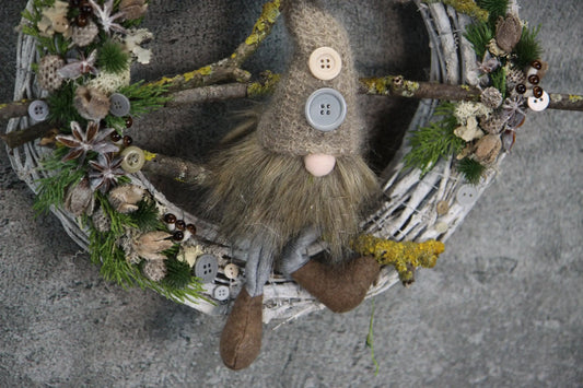 Türkranz Türdeko Türschmuck Weihnachten Weidenkranz Wichtel Zapfen Pilz Stern Apfel Knöpfe Tanne Band Modern