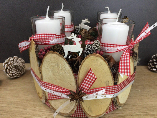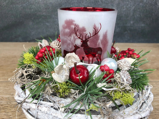 Adventsgesteck Gesteck 20cm Windlicht Glas Teelicht Hirsch Modern Rund Moos Thuja Zapfen Rot Weiß