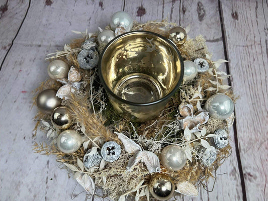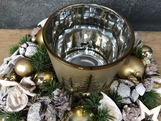 Adventsgesteck 23cm Windlicht Teelichthalter Teelichtglas Trockenblumen Gesteck Hirsch Modern Moos Thuja Zapfen Eicheln Gold Weiß