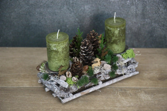 Adventsgesteck Hirsch Modern Länglich Moos Thuja Zapfen Eicheln
