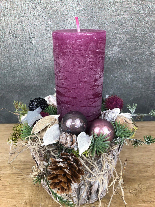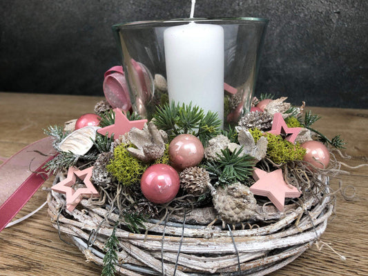 Adventsgesteck 20cm kleines Gesteck Glas Teelicht Rosa Stern Modern Rund Zapfen Weiß