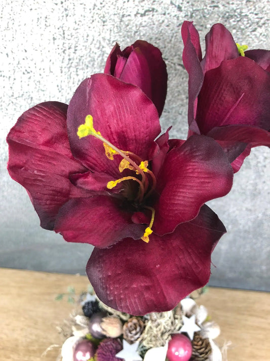 Adventsgesteck Gesteck Amaryllis Beere Modern Rund Moos Thuja Zapfen Rot Weiß
