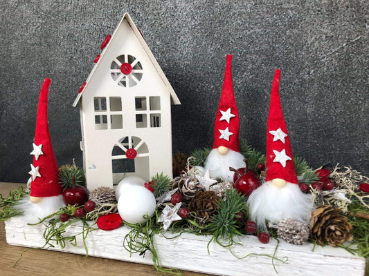 Adventsgesteck Wichtel Stern mit Haus auf Tablett Adventskranz Adventskalender künstlich haltbar