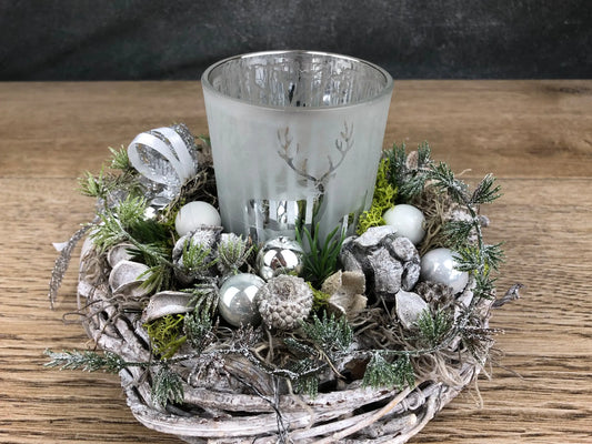 Adventsgesteck Gesteck 20cm Windlicht Glas Teelicht Silber Hirsch Modern Rund Zapfen Weiß