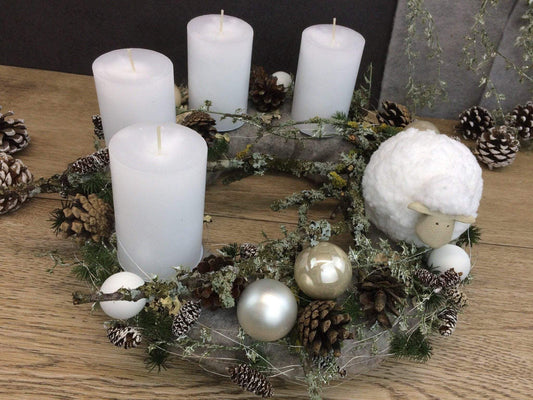 Adventskranz Adventskalender Schaf Zapfen Kerzen Kugeln Hutzeln Tanne Zweige Filz Modern Natürlich Getrocknet Künstlich Haltbar