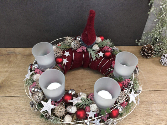 Adventskranz Wichtel Gläser Kugeln Sterne Äpfel Tannen Filz Zapfen Teelichter Draht Silberdraht Rot Grau Silber