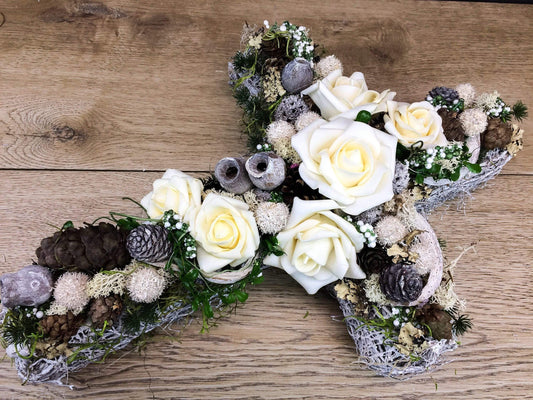 Grabschmuck Grabgesteck Gesteck Grab Allerheiligen Reebkreuz Kreuz Rose Grave Arrangument grave flowers longlasting Grabdeko Grabdekoration