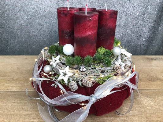 Adventskranz Adventskalender Filz Kugeln Sterne Moos Zedern mehrjährig rund