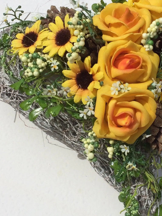 Grabgesteck Grabschmuck Rosen Sonnenblumen Zapfen Beeren Schleierkraut Tillansie Herz Grabdeko Grabdekoration
