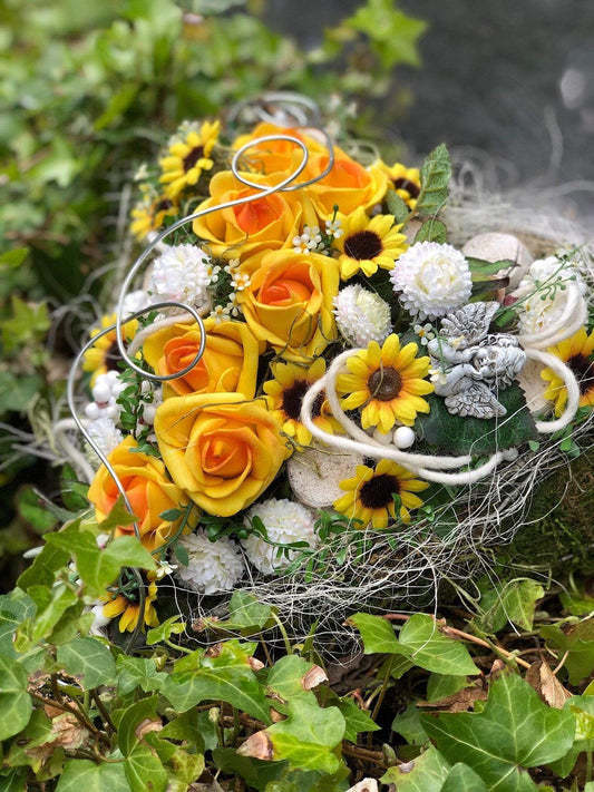 Grabgesteck Grabschmuck Herz Rosen Sonnenblumen Astern Birkenscheiben Filz Draht Engel Grabdekoration Grabschmuck Allerheiligen
