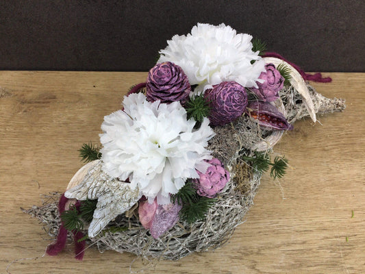 Grabgesteck Grabschmuck Allerheiligen Totensonntag Nelken Exoten Zapfen Gesteck Grab