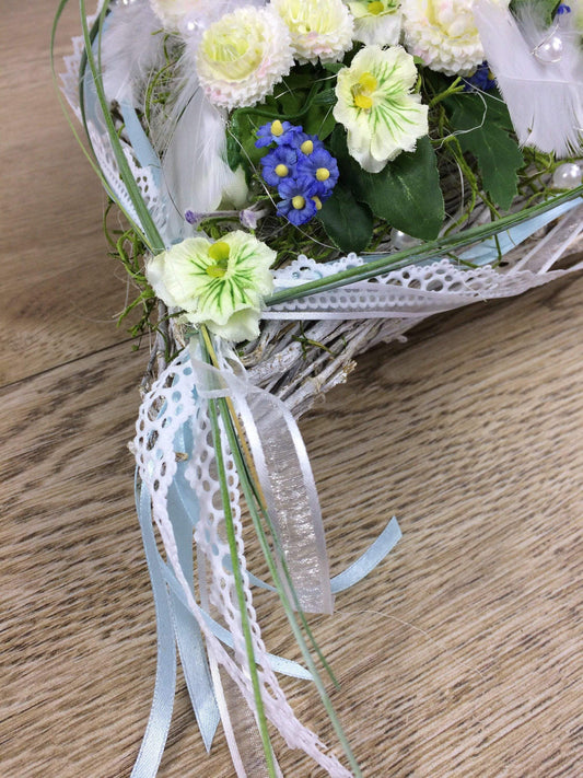 Grabgesteck 25x35cm Frühling Grabschmuck Gesteck Herz Gänseblümchen Vergissmeinnicht Grabdekoration Grabschmuck Allerheiligen