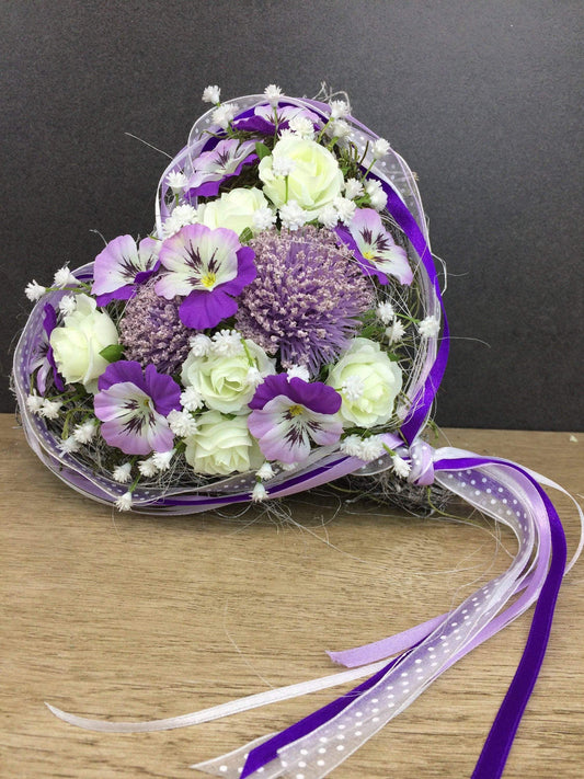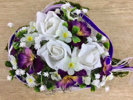 Grabgesteck Grabschmuck Rose Viburnum Herz Stiefmütterchen Hornveilchen Veilchen Lila Weiß Gesteck Grab Schleierkraut