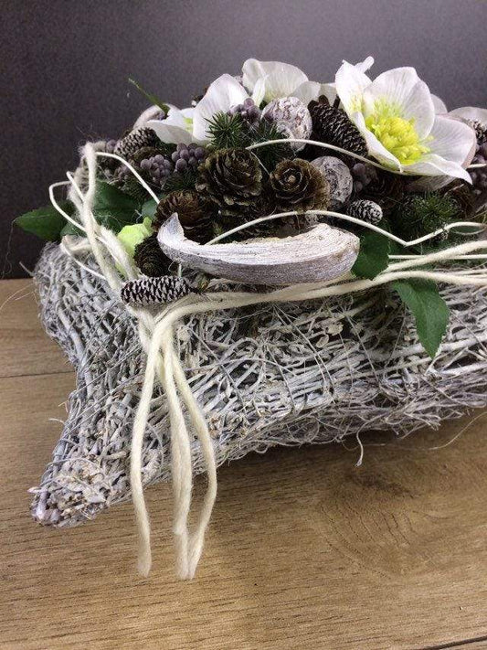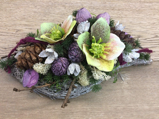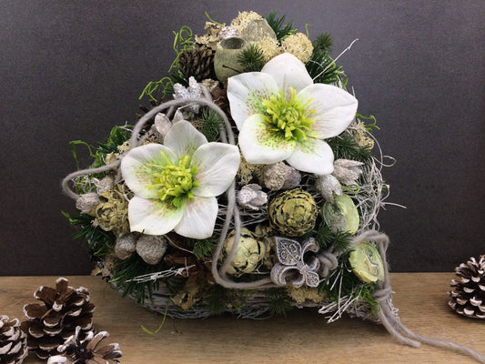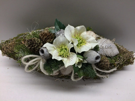 Grabgesteck Grabschmuck Gesteck Allerheiligen Christrose Christrosen Tanne Zapfen Exoten Moos Raute Filzschnur Hutzeln Buchecker