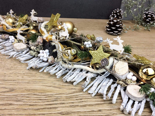 Tischdeko Tischgesteck Tischschmuck Gesteck 20er LED Lichterkette Wunschfarbe Advent Adventskranz Weihnachtlich Hirsch Band Kugeln