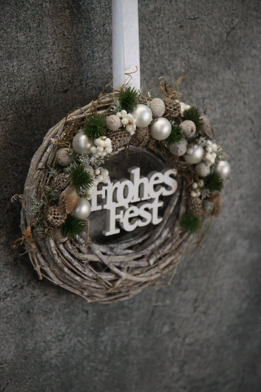 Türkranz Frohes Fest Türschmuck Weihnachten Weidenkranz Zapfen Kugeln Stern Apfel Knöpfe Tanne Band Modern