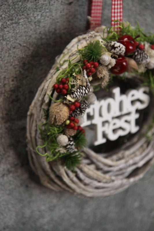 Türkranz Frohes Fest Türschmuck Weihnachten Weidenkranz Zapfen Kugeln Stern Apfel Knöpfe Tanne Band Modern